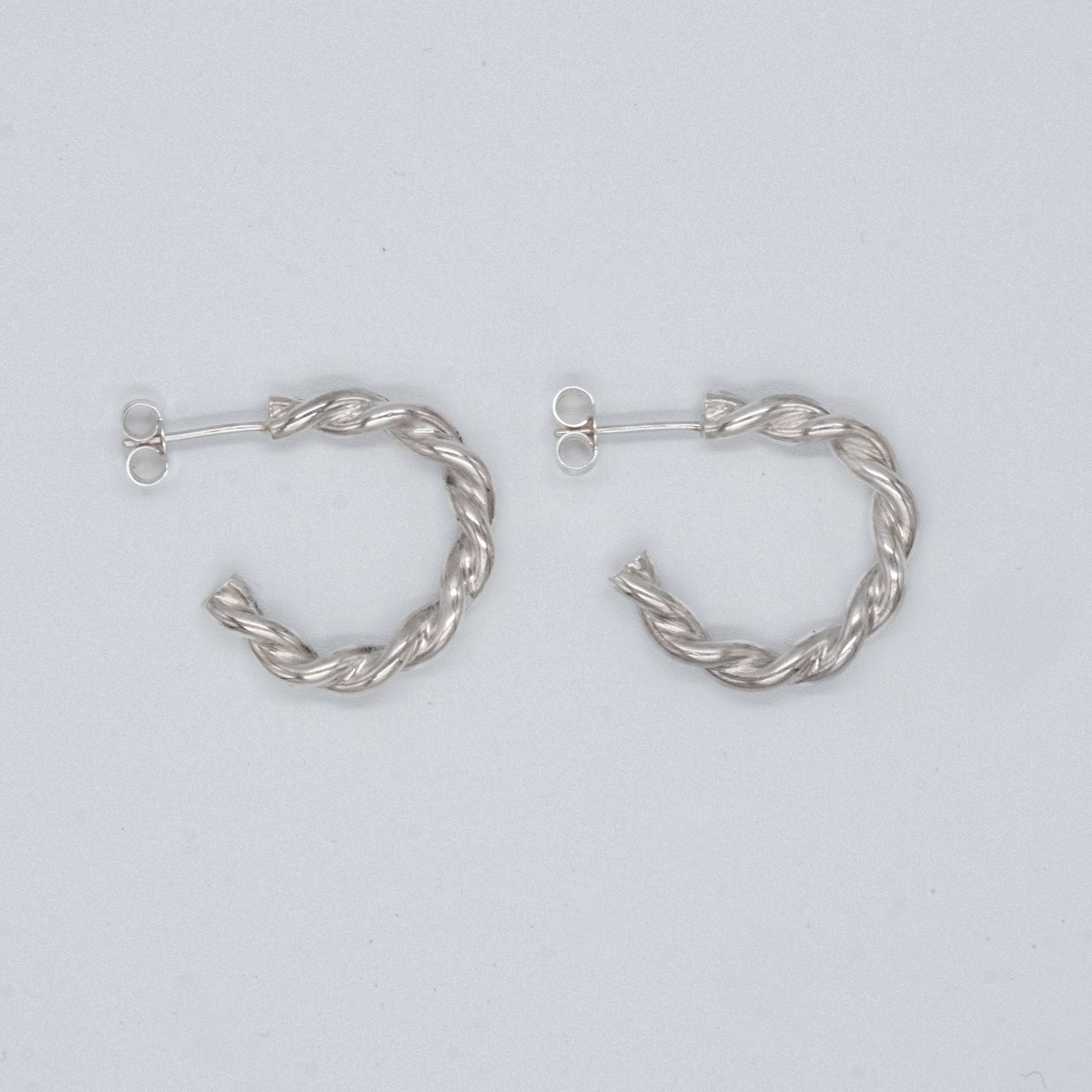 Solid sterling silver half-hoop earrings in a chunky twisted design. Includes scroll earring backs.