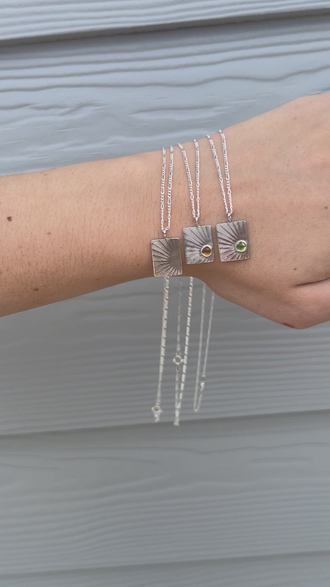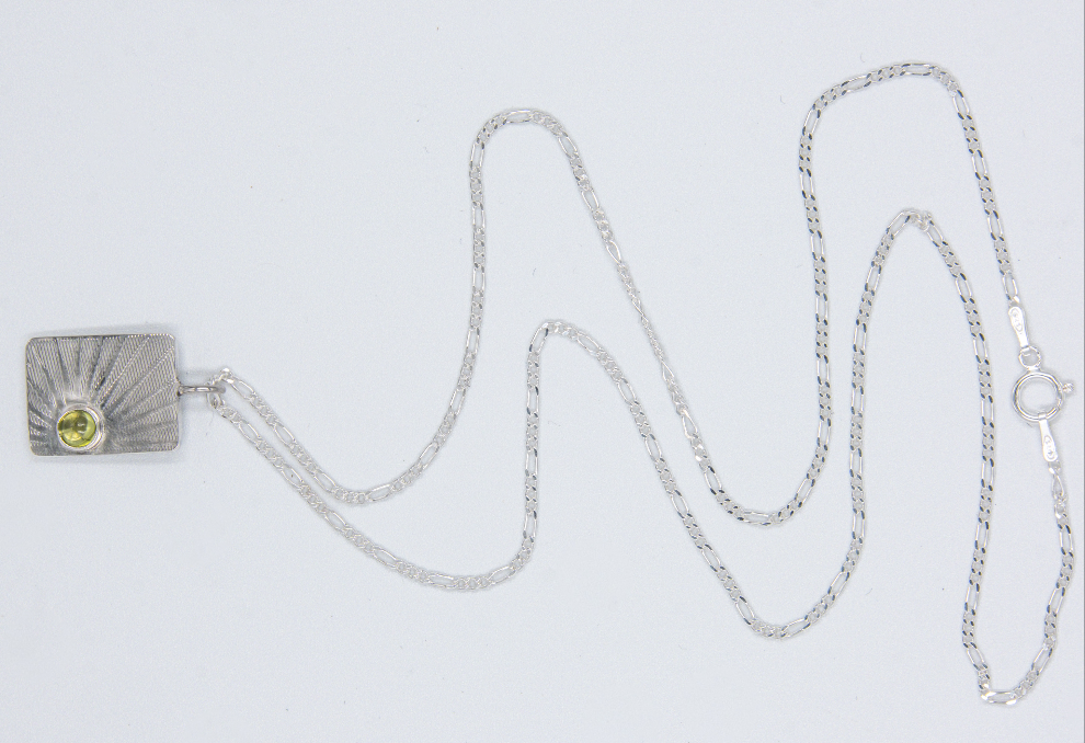 Handcrafted, recycled sterling silver pendant with light ray design and cabochon peridot. 45cm figaro chain.