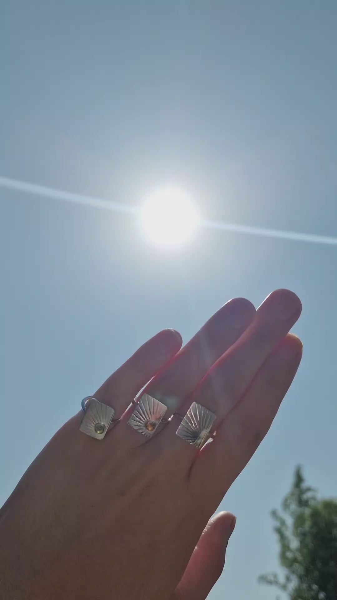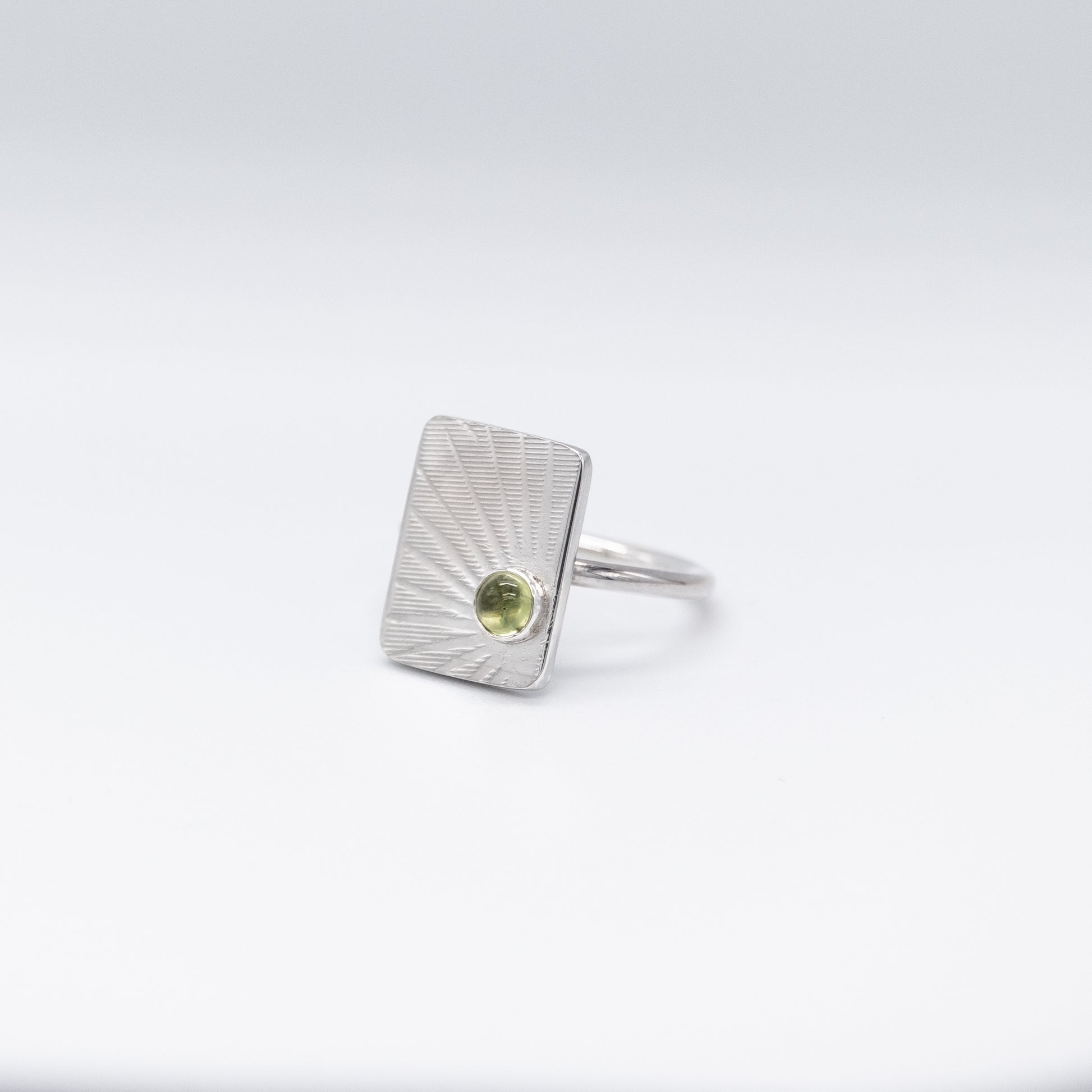 Handcrafted, recycled sterling silver ring with light ray design and cabochon peridot. 2mm band.