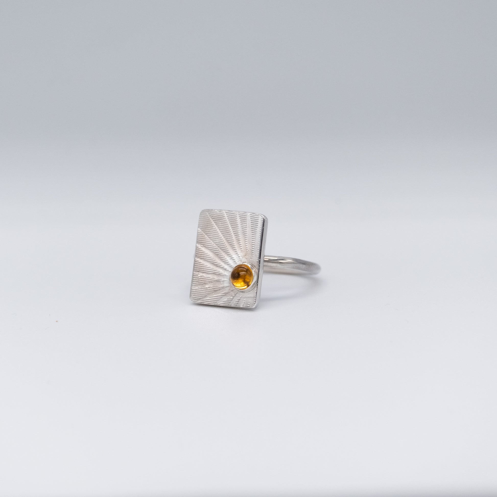 Handcrafted, recycled sterling silver ring with light ray design and cabochon citrine. 2mm band.