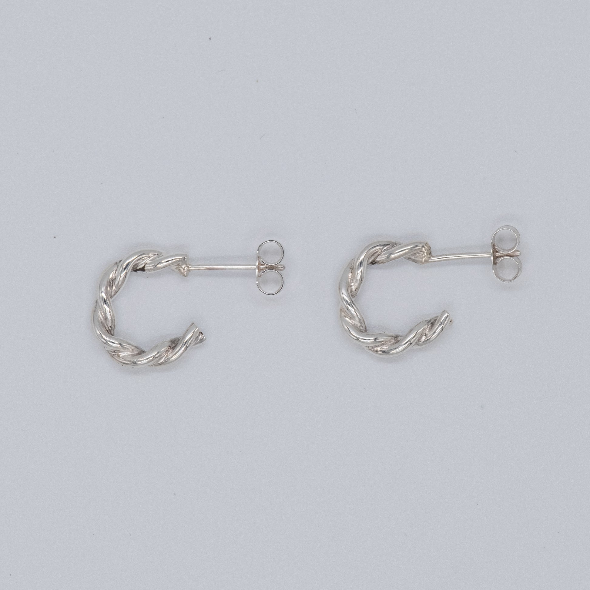 Solid sterling silver half-hoop earrings in a twisted design. Includes scroll earring backs.